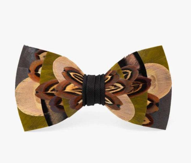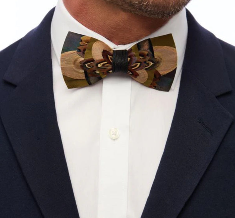 Handcrafted with a nature inspired palette, the Moorcroft Style Bow Tie features an asymmetrical and triple-layer pattern of greens, tans, and browns. Made with turkey, pheasant, and peacock feathers, this stunning handcrafted design includes depth and dimension while showcasing natural iridescence as it moves through changes in the light.