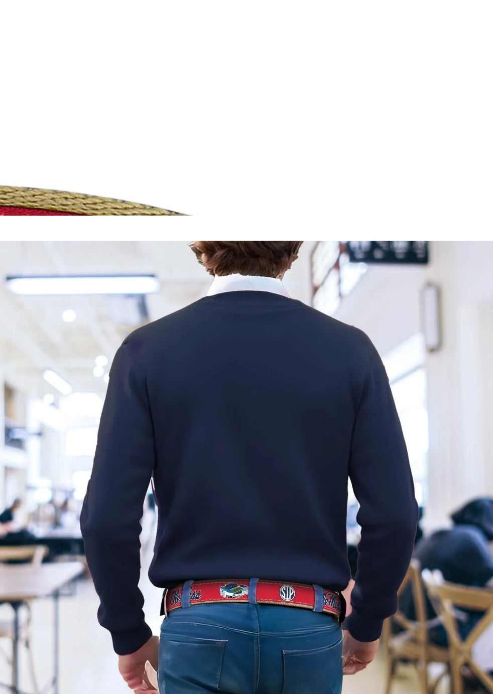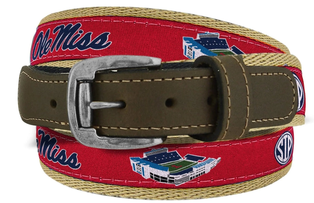 Show your Ole Miss Rebels pride with an original Zep-Pro collegiate Stadium Collection woven ribbon belt. This accessory is popular among college students and alumni. It is a stylish and unique way to show enthusiasm with a pair of casual slacks, jeans or khakis. This Zep-Pro belt is constructed of dark brown full grain crazyhorse leather tabs, cotton wool web backing and an antique roller buckle. The school’s official multiple logos, repeated and proudly displayed on the woven ribbon.