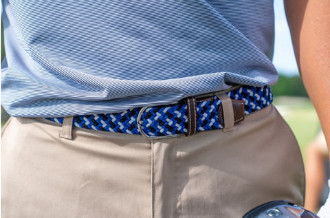 The Jupiter multi-color braided stretch belt. Blue, Black, and White Belt with a silver rounded buckle and dark brown leather finish stamped with the Roostas logo. An adjustable clasp goes through the woven belt, allowing for adaptable sizing. Designed for a firm but comfortable fit.