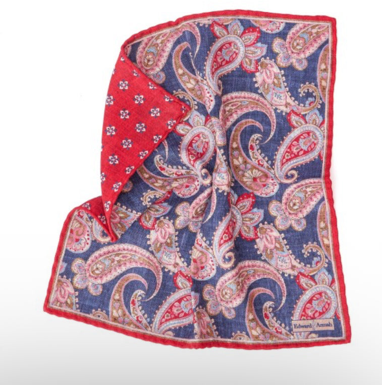 NAVY PAISLEY/FLORET NEAT PRINT REVERSIBLE POCKET SQUARE, 100% SILK SHAPPE, HAND ROLL (33X33CM)