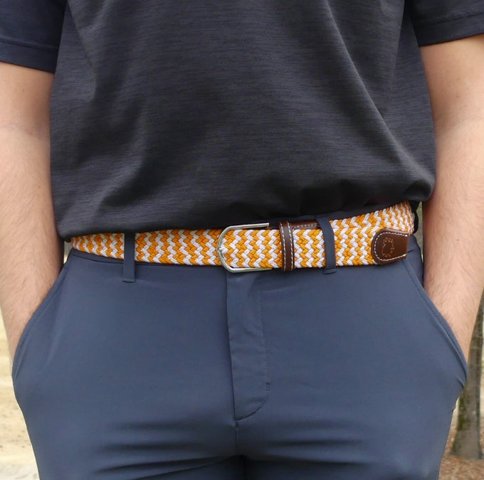 The Cumberland two-toned Chevron woven elastic-stretch belt. Orange and White belt with a rounded buckle and dark brown leather finish stamped with the Roostas logo. An adjustable clasp goes through the woven belt, allowing for adaptable sizing. Designed for comfort both on and off the course.