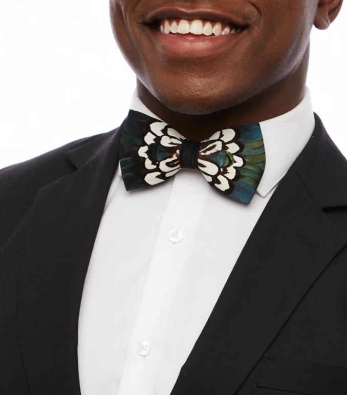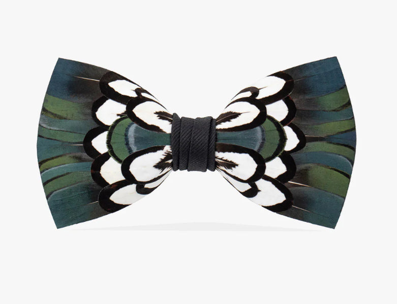 Dorn is crafted with navy blue, forest green, and black and white pheasant feathers. Center wrap is black grosgrain.