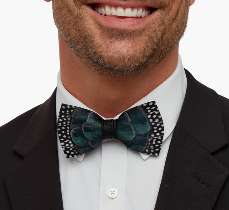 The Green Pond is a muted, iridescent blue-green bow tie with black and white edges. A little bit chic, a little bit classic, we spotlight subtle pheasant feathers with our trademark guinea feather outline.