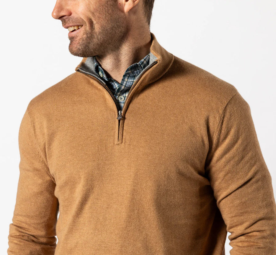 Crafted from a luxurious blend of organic cotton and cashmere, the Ridley ¼ Zip Sweater delivers unmatched softness with a lightweight feel. The 12-gauge jersey stitch offers a clean, refined drape, while subtle tipping and a contrast interior collar add just the right amount of visual interest. It strikes the perfect balance between polished and relaxed—all in a style that’s conveniently machine washable.