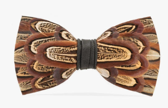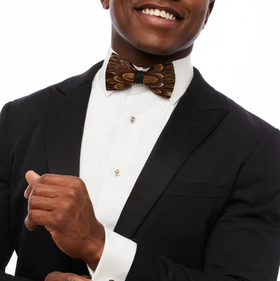 Handcrafted with a nature inspired palette, the Moorcroft Style Bow Tie features an asymmetrical and triple-layer pattern of greens, tans, and browns. Made with turkey, pheasant, and peacock feathers, this stunning handcrafted design includes depth and dimension while showcasing natural iridescence as it moves through changes in the light.