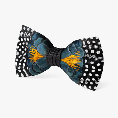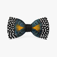 Bold, unique, and full of personality, the Owen's Town Bow Tie features a striking combination of guinea, yellow pheasant, and navy lady feathers. The soft yellow pheasant blossoms out from a bed of small navy lady feathers, creating a rich contrast, while the big dot guinea ties in with the black borders of the navy lady feathers, giving this bow tie a bold, commanding silhouette. Perfect for making a statement with its intricate feather details and vibrant colors, the Owen's Town Bow Tie adds an unexpected touch of natural elegance to any formal look.
