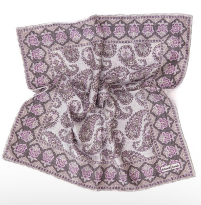 GRAY PAISLEY PRINT POCKET SQUARE, 100% SILK TWILL, HAND ROLL, 43X43CM