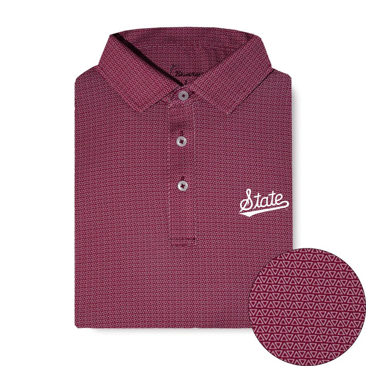 Make a statement with the officially licensed Mississippi State Apex Print Performance Polo, designed for those who demand both style and performance. Featuring a subtle two-color pattern, this polo delivers a sharp, masculine look that’s perfect for any occasion—whether you're out for a weekend outing, at a sports event, or enjoying a casual day with friends.
