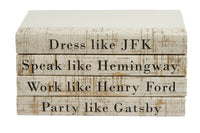 4 Vol. decorative book stack with "Dress Like JFK…" quote on Gold Brushstrokes