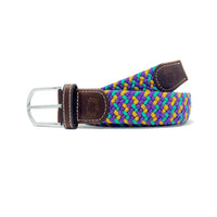 The Krewe Mardi-Gras Special Release woven elastic-stretch belt. Purple, Green, Gold belt with a rounded buckle and dark brown leather finish stamped with the Roostas logo. An adjustable clasp goes through the woven belt, allowing for adaptable sizing. Designed for comfort both on and off the course.